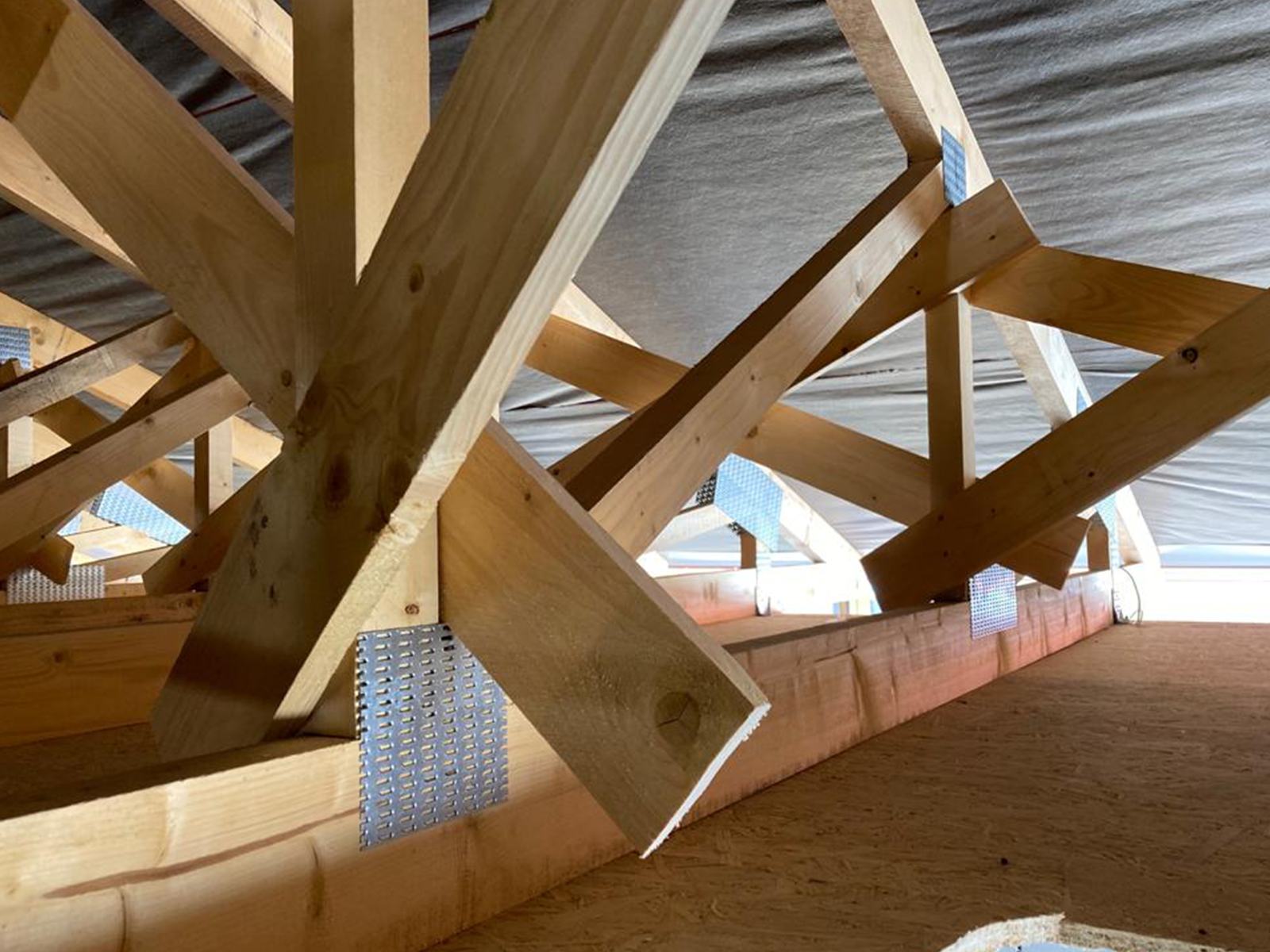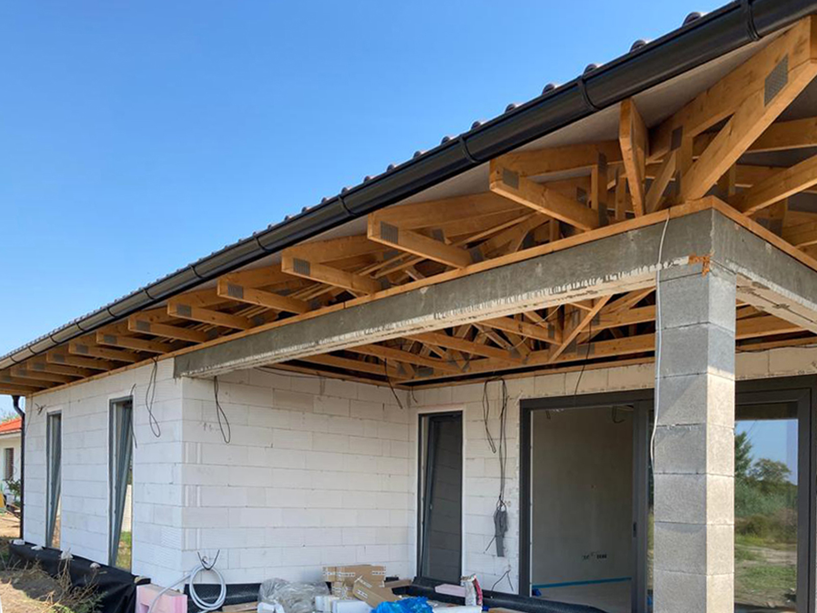 Voľné fúkanie na OSB dosku s prefúknutím cez veniec na presah strechy.